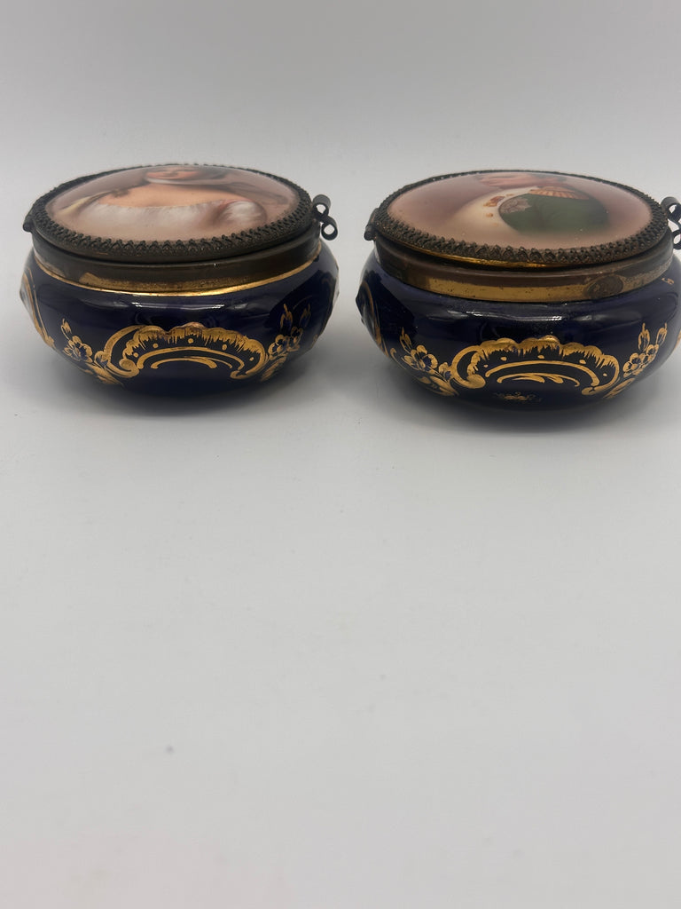 Pair of oval European porcelain boxes. Cobalt blue and gold with portraits of Napolean and Marie Louis on lids. Artist signed. Circa 1900.
