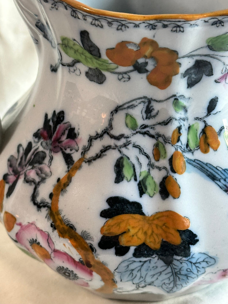 Water Pitcher. Masons Ironstone Colorful Birds and Flowers. Circa 1825. 7 1/4"
