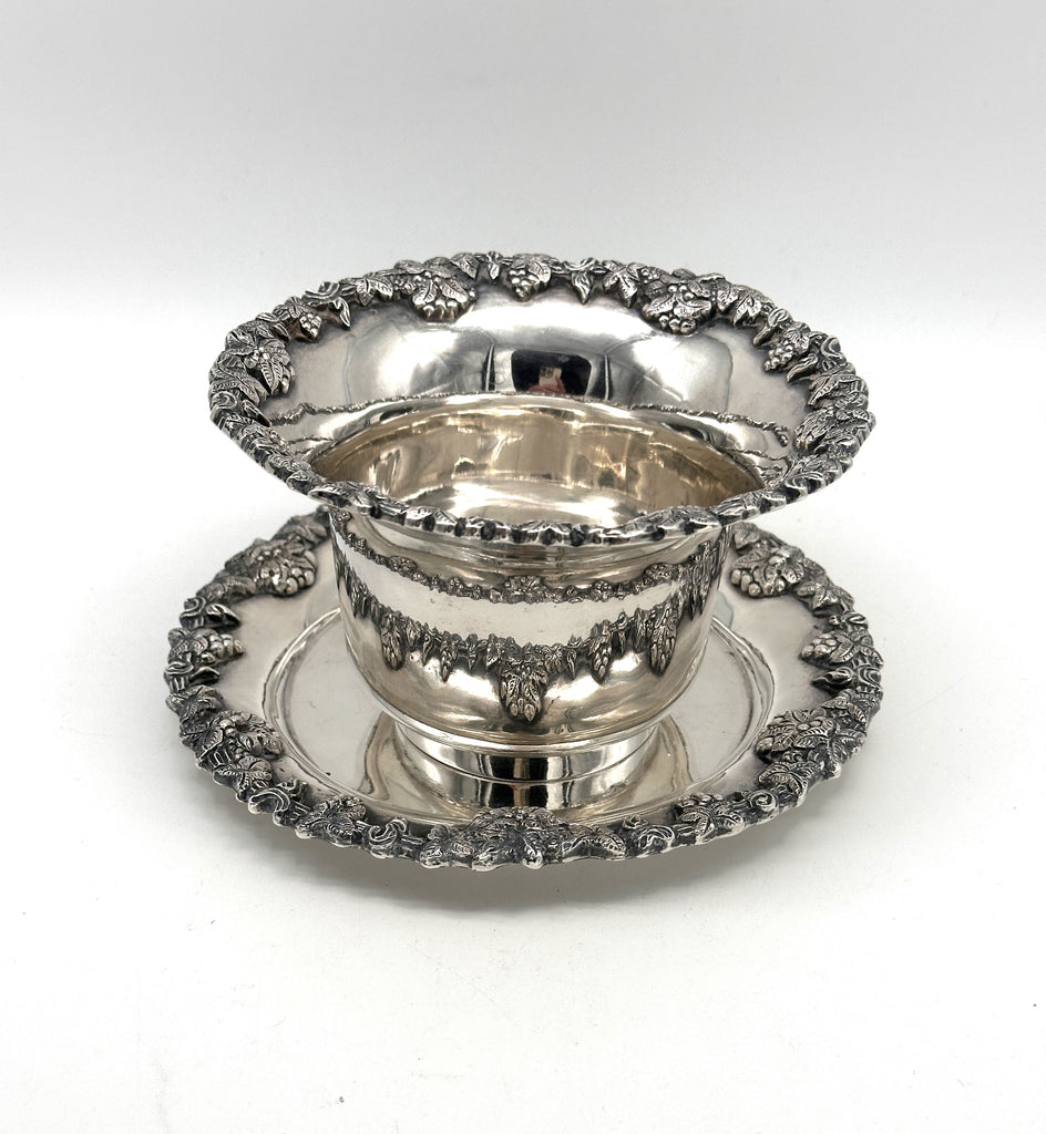 Small serving bowl with underplate. Mexican sterling silver. Sanborns. Applied grapes and leaves.