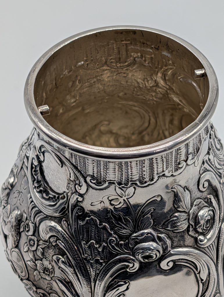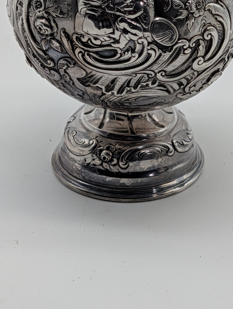 Repousse scenes of man and woman in garden with scrolling flowers and leaves. Notched lid to hold in place.