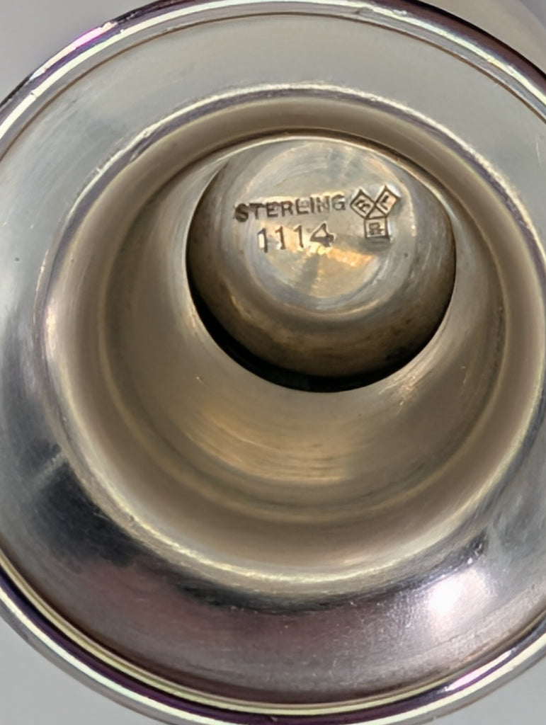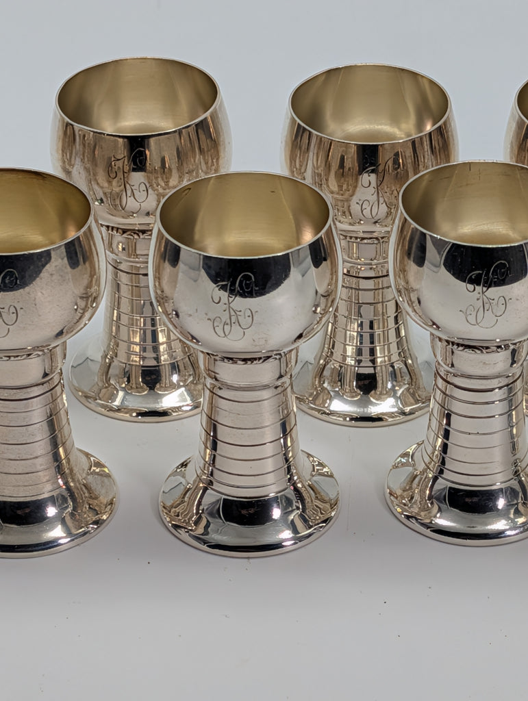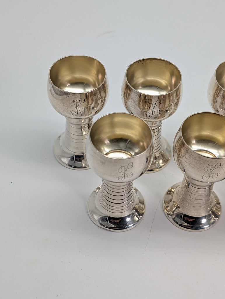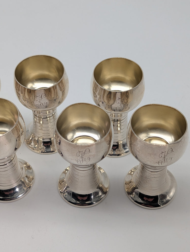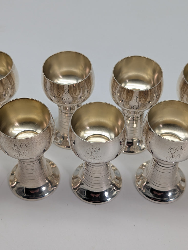 Set of 12 footed shot glasses or cordials. American sterling silver by Lunt. #1114