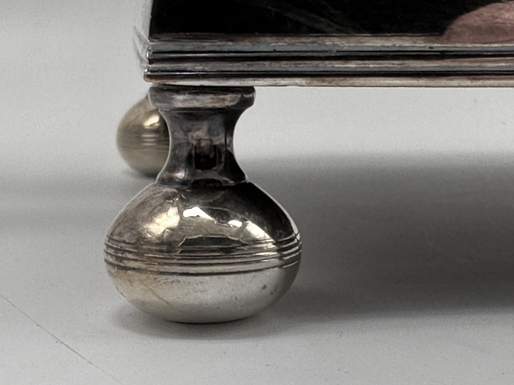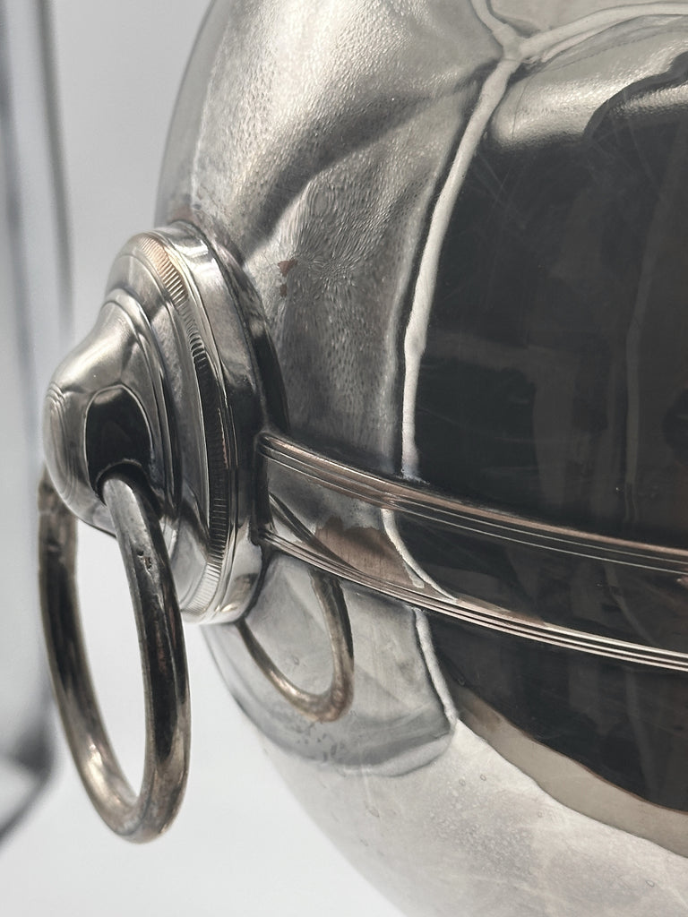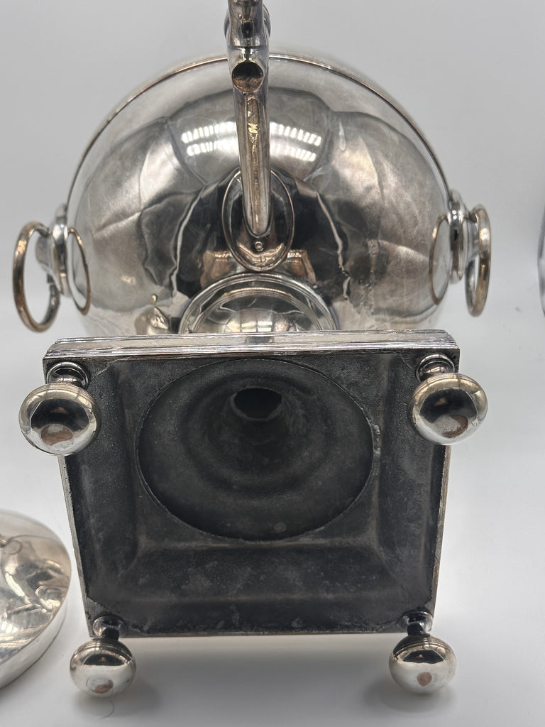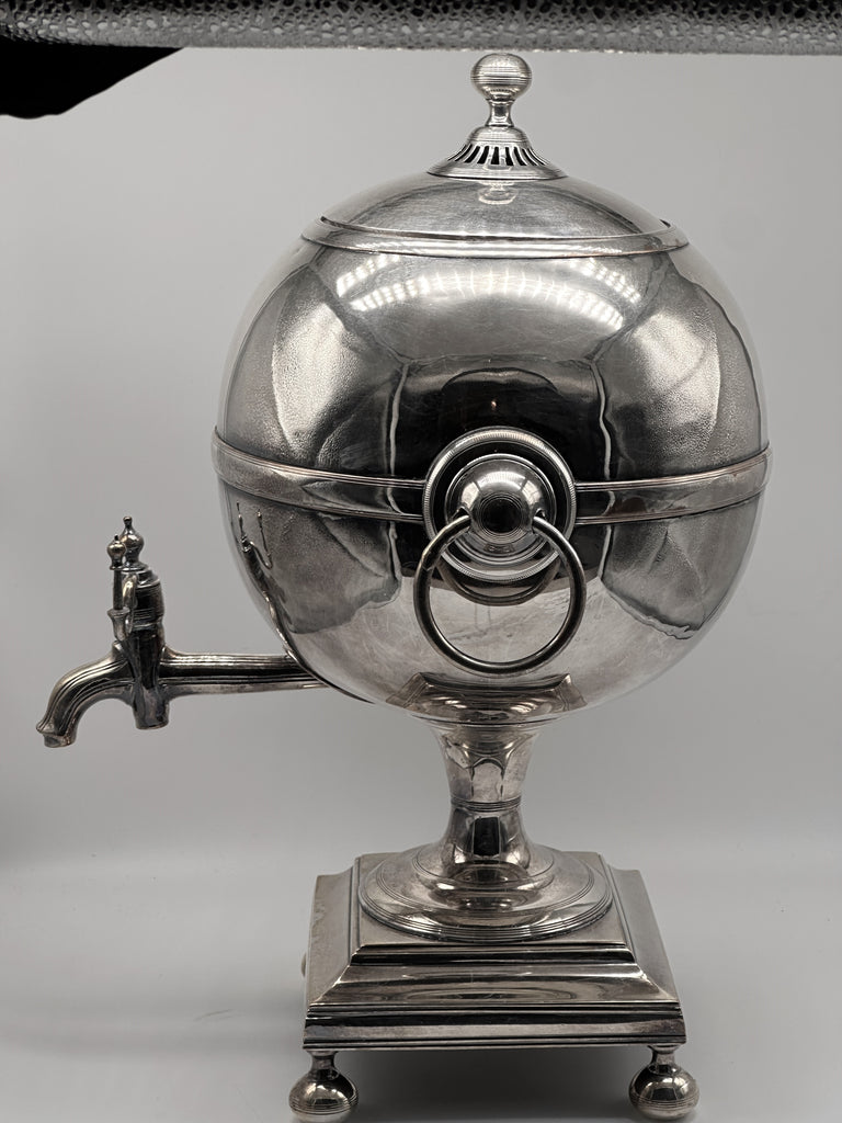 Large ovoid tea urn. English Sheffield silverplate over copper. Ovoid body with ring handles on square stand with four ball feet. 19th century.