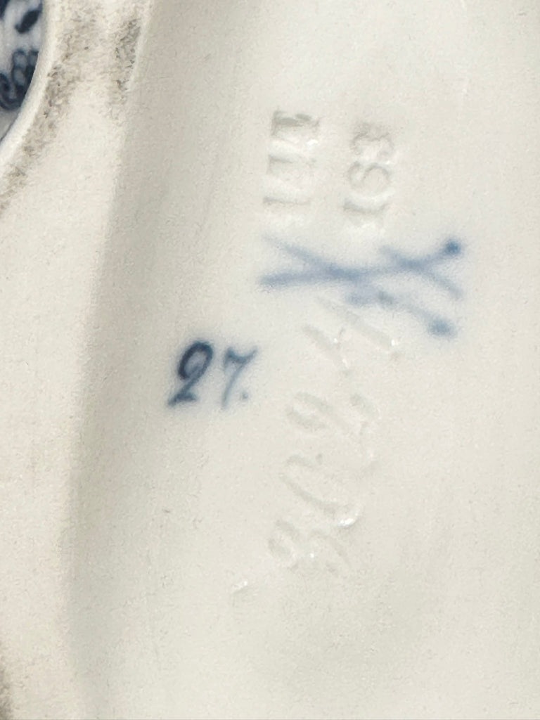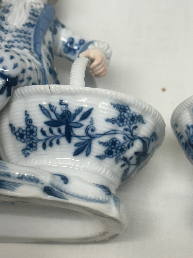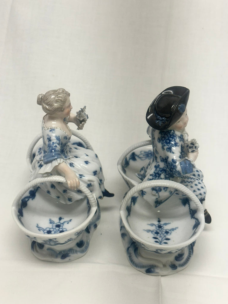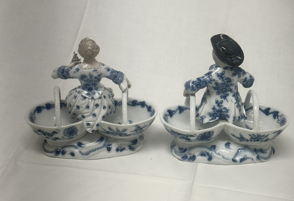 Pair of Meissen blue and white porcelain double salts. Boy and girl figures.
