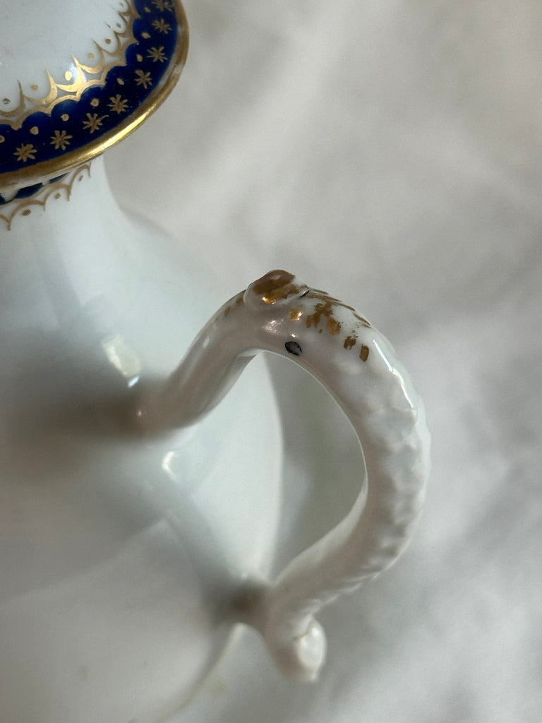 Small pitcher. Chinese Export porcelain. White with blue flowers in jardinière. Peach finial.